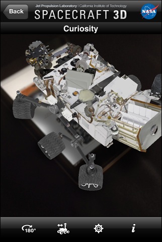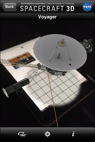 AR技術を使って、目の前にNASAの様々な探査機を画面に映し出すという遊び心あふれたアプリ。 最初に[ Get Marker ] というボタンを押してPDFを入手するという一手間がかかりますが、このマーカーのある場所に探査機を表示するための準備です。 自分の場合は、このマーカーをダウンロードしてiPadの画面に表示させました ( 紙に印刷してもかまいません )。 そして、そこにiPhoneのカメラを向けると...ボイジャーやキュリオシティなどの探査機が目の前にあるかのように画面に表示されます。 色んな角度から見たり、キュリオシティの場合はアームを動かしたりもできます。