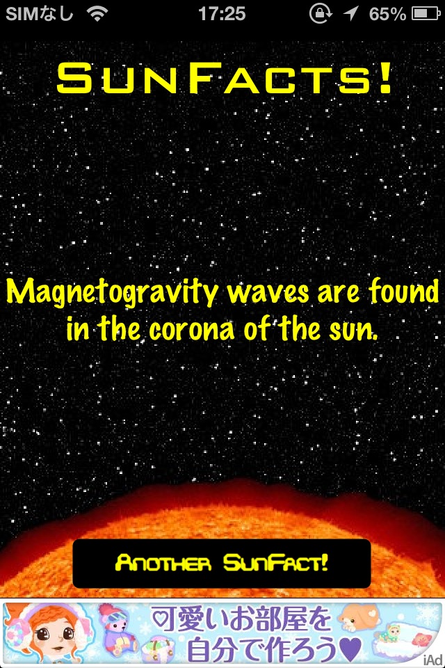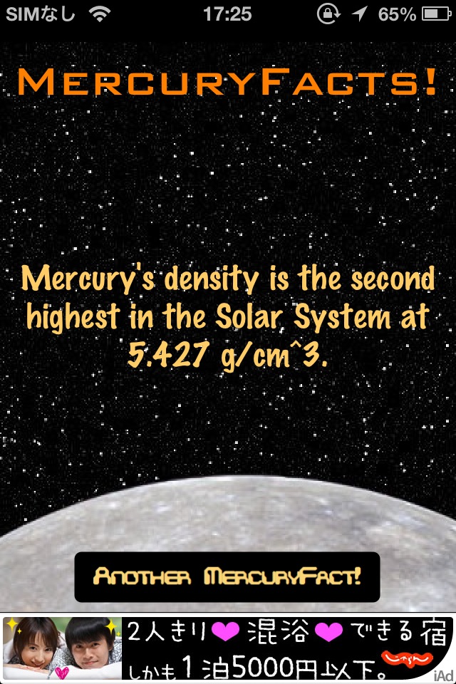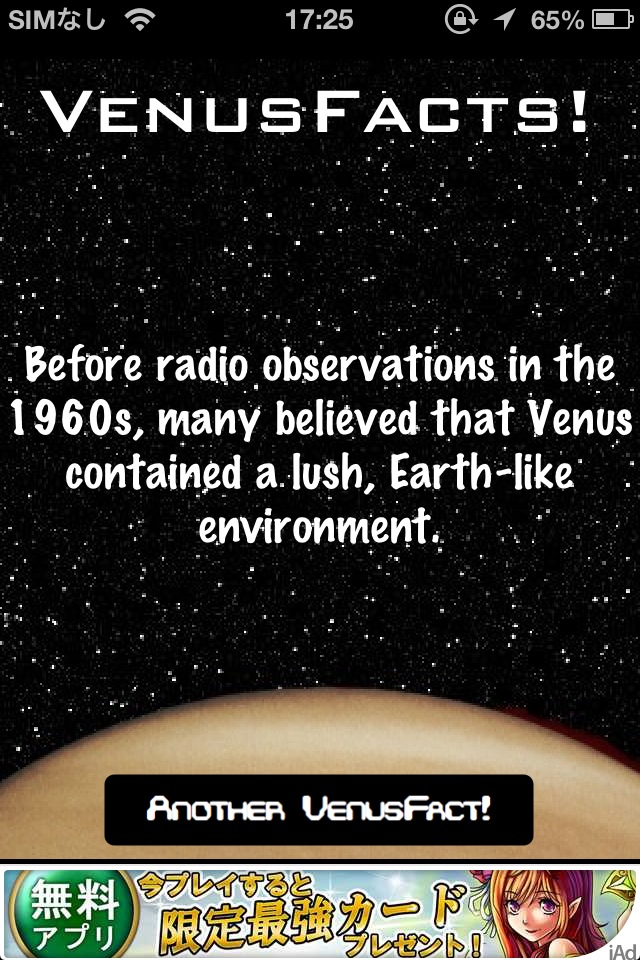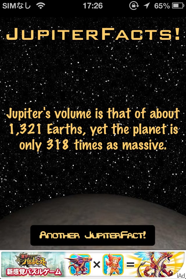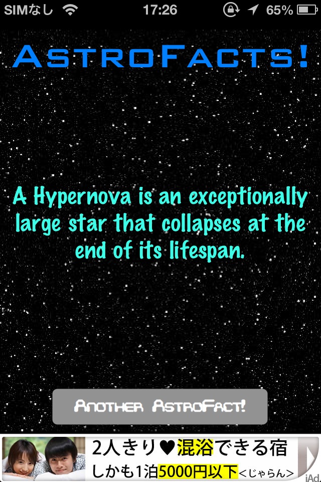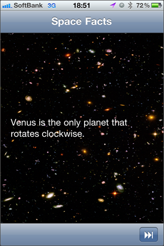 宇宙に関する豆知識をランダムに表示するソフト。起動して画面右下のボタンを押すのみ。内容は悪くないんですが、まだ数が少ないのとビジュアル的に弱いです。「バージョンアップで数を増やす」ということのようですのでバージョンアップを待ちましょう。英語のみなので、こういうソフトの日本語版があるといいのになぁと思います。 [ Retina ]
