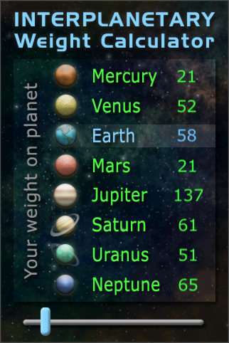 太陽系の他の惑星に行ったときに体重がどのように変わるのかを計算するソフト。画面の下のスライダーで体重を指定します。