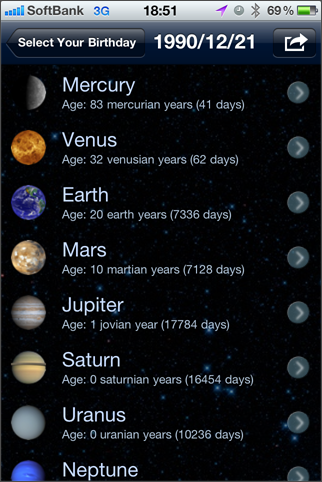 太陽系の各天体の公転周期で計算するとあなたの年齢は何歳かを計算します。