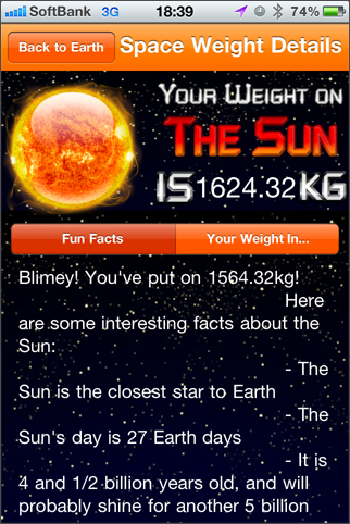 自分の体重を入力すると、太陽系の別の天体だとどうなるかを表示するソフト。各天体の情報表示機能もあります。