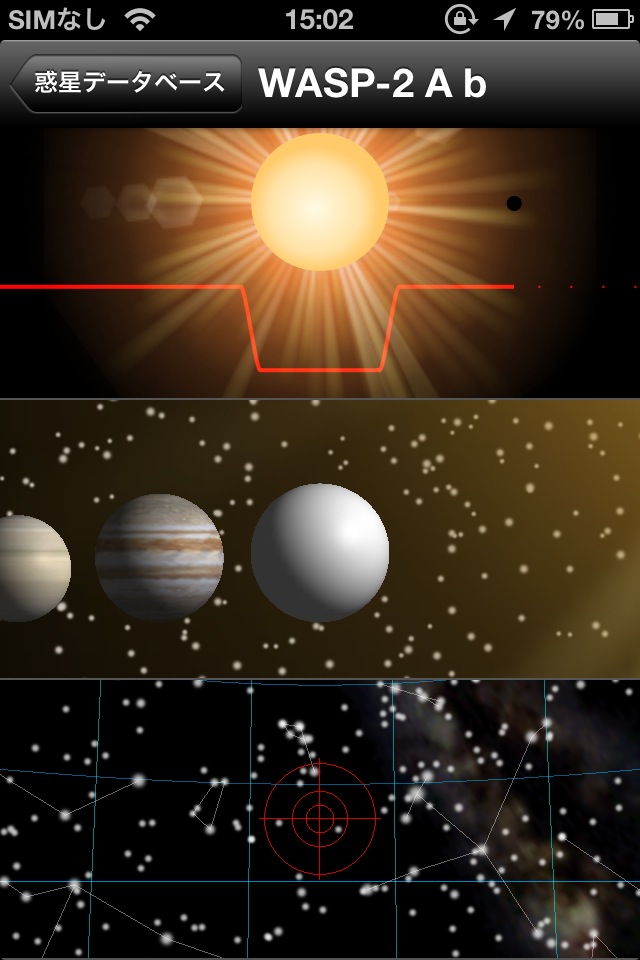 Exoplanetとは「太陽系外惑星」のこと。太陽系外の惑星も様々な方法で発見されており、このアプリでかなり詳細な情報を見ることができます。かなりマニアックなソフトですが、回っている恒星が惑星が前を横切ることで明るさがどのように変化するかや、太陽系天体との大きさの比較もグラフィカルに表示していて、見ているだけでも楽しめます。
