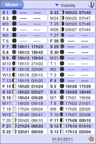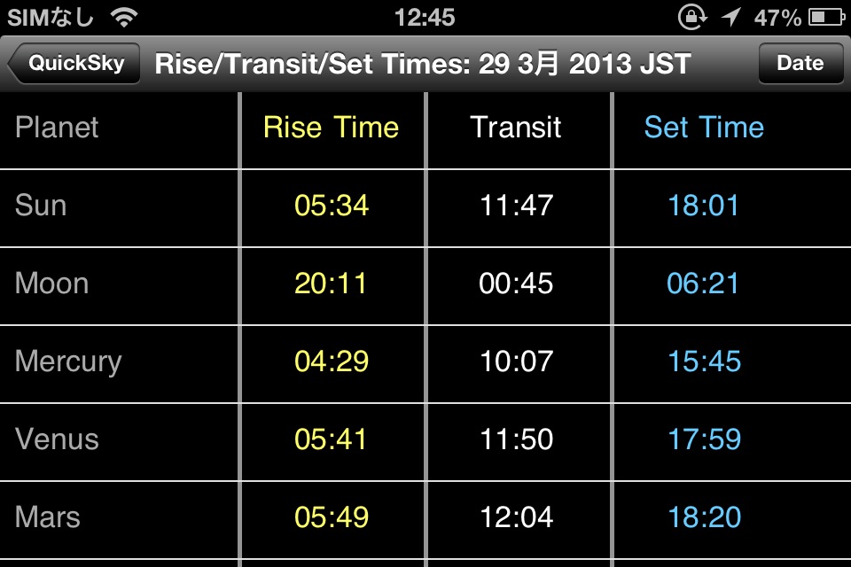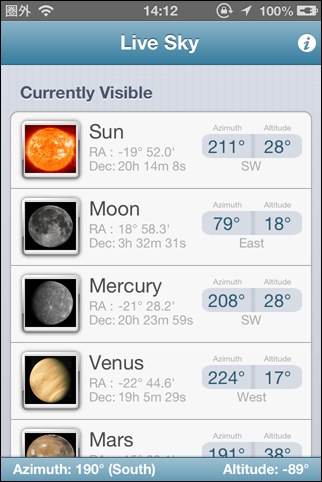 University of Western Sydney による天文現象の一覧を表示するアプリ。英語で、かつ、テキストのみによる情報なのが残念です。
