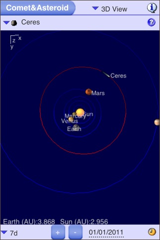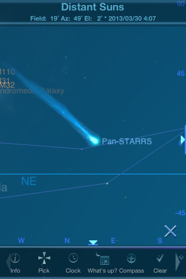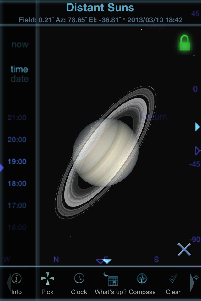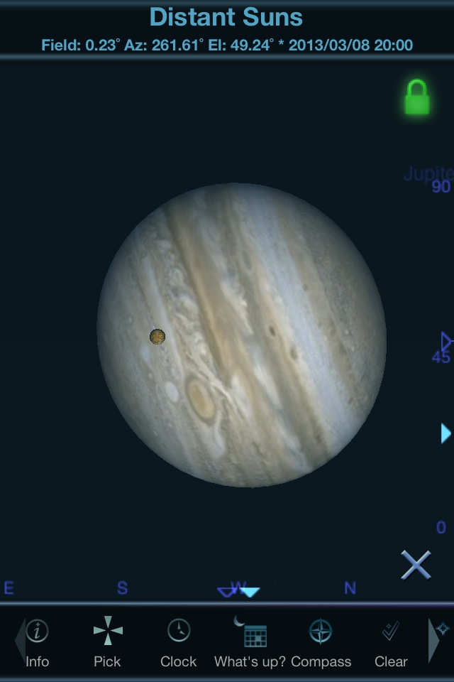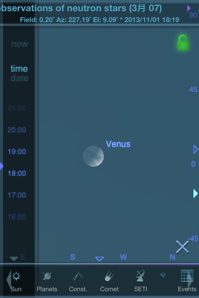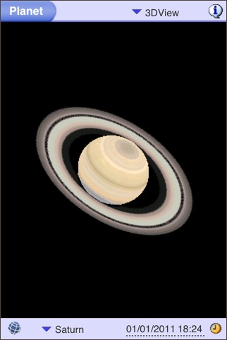 本格的なプラネタリウムソフトの1つ。機能は多く、天の川の表示も写真のように美しいですが、動きは軽快です。ズームインしてシームレスに月の満ち欠けや木星の衛星や土星の輪の傾きも確認できます。特定の星を常に中央に表示するオブジェクトロック機構もあります。彗星についてはアプリそのものにデータを抱え込んでいるような動きをしますが、尾の方向も分かるように表示されます。