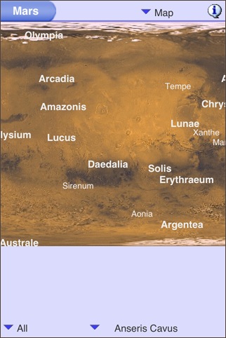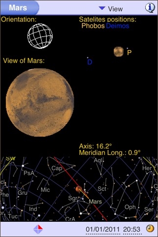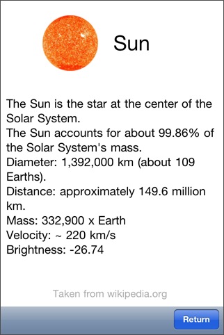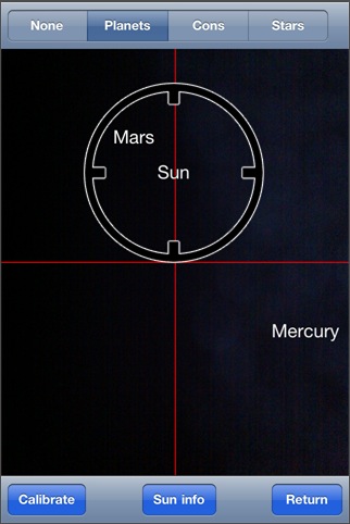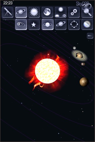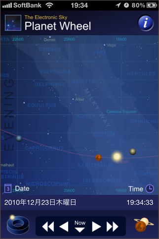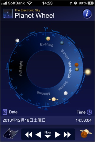 太陽系天体を円形状のホイール上に表示するソフト。デザイン的には面白いですが、電子コンパスには対応してないため、天体観測用としての実用性はあまりなさそうです。星図表示もあるので、こちらの方が実用性はあります。各天体にタッチすると情報が表示されますが(月面図などもあり)、インターネットアクセスが必要になります。