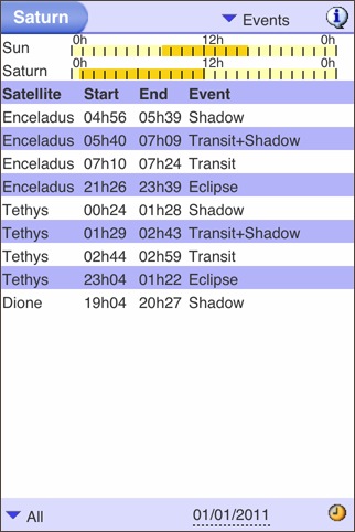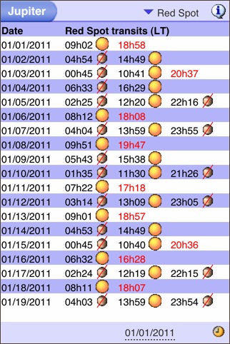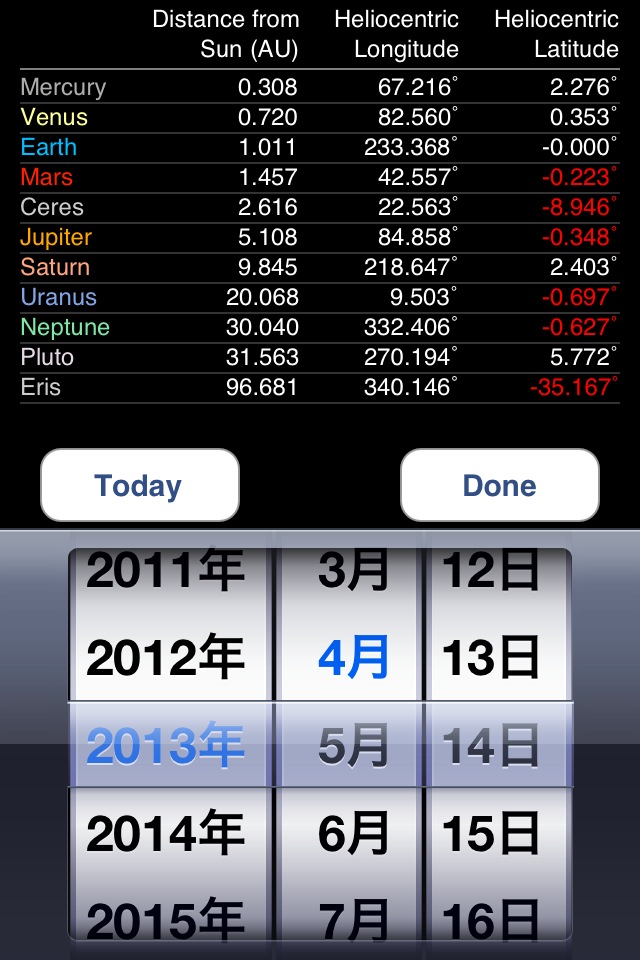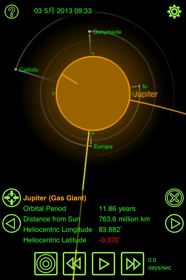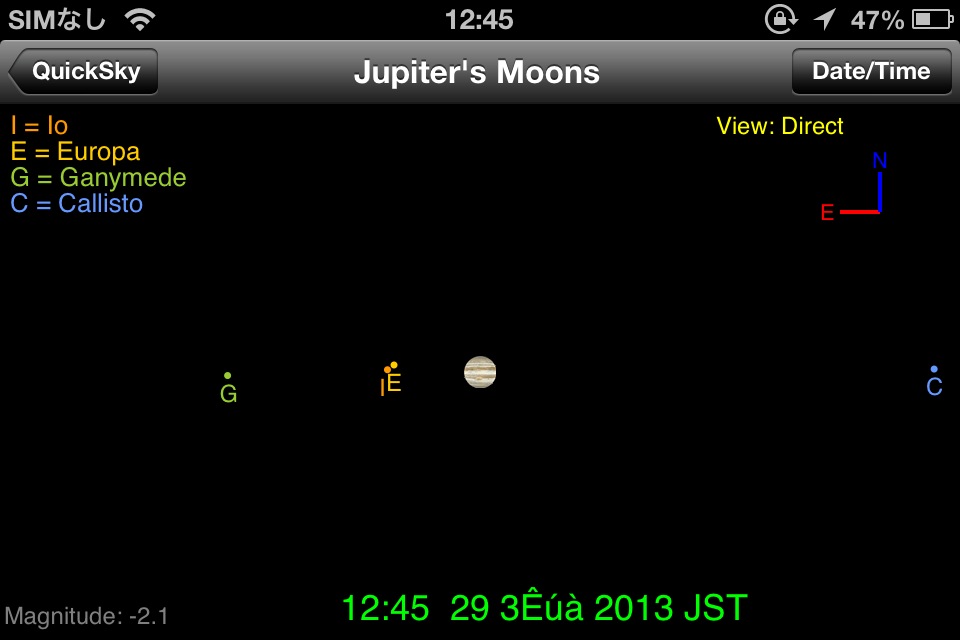 木星/土星/天王星/海王星の衛星を観測する時のためのアプリ。時刻を指定すると衛星の位置が表示されます。衛星が惑星の表面に影を落とす現象 [ Eclipsing ] 、惑星の影に衛星が入る現象 [ Eclipsed ]、土星の輪の傾斜も計算しています。通常のモードではピンチ操作で拡大縮小できますが、[ Simulate Telescope ] モードをオンにすると、望遠鏡で覗いたときにどのように見えるかをシミュレートしてくれます。まさに観測者のために作られたソフトといった感じです。画面の下にあるスライダーで時間を前後に変化させられますが、2日分しか動かせなくて、それ以前/以後の予報を見たい場合は、日付入力画面に行かないといけないのがちょっと面倒です。