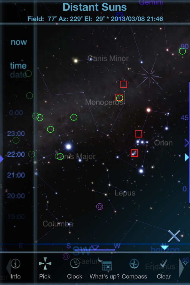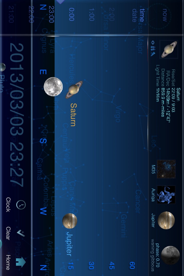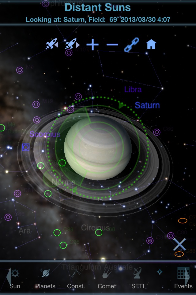 本格的なプラネタリウムソフト。画面右下のプラスボタンでズームインしていくことで、シームレスに月や惑星やその衛星、また星雲・星団の拡大映像に切り替わっていきます。選択した天体が日を追ってどのように移動していくかの表示もあります。この機能を持つソフトは少ないです。