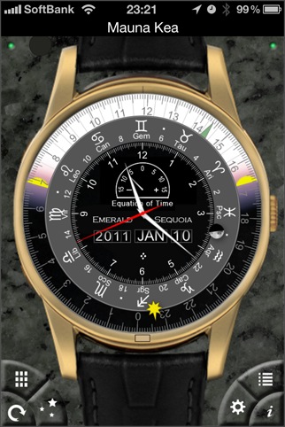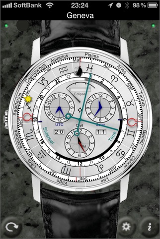腕時計型の天文ソフト Emerald Chronometer の中の Geneva という時計のみが使える廉価版ソフトです。表と裏がありますので、2種類から選ぶことが出来ます。タイムサーバーでの時計合わせも出来ます。 [ NTP ]