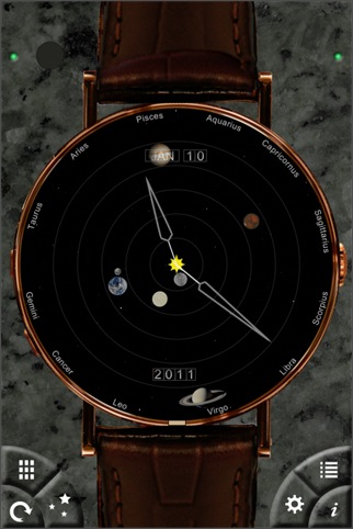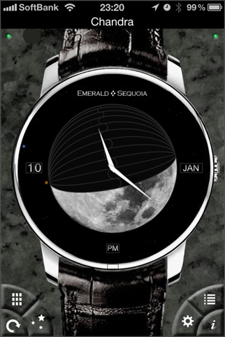 起動すると美しいデザインの腕時計が表示されます。左右にフリックしたり、左下のボタンで裏面を押すことで26種類の時計が現れます。しかも、中には太陽/月/惑星の位置や満ち欠け、出没時刻の情報が表示される時計もあります。タイムサーバーで時刻を合わせる機能も持っています。 [ NTP ]