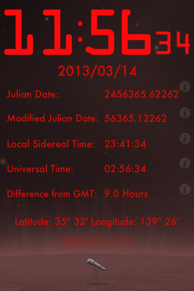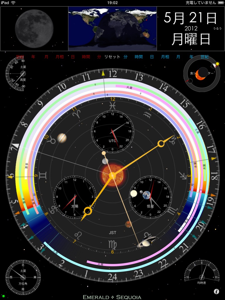 天体の情報が沢山表示されている時計アプリ。パッと見た感じはオシャレな時計に見えますが、じっくり見ると天体の情報がギッシリと詰まっていることが分かります。太陽系の惑星/月の配置、太陽/惑星/月の出没/高度/方位、月の形、地球の影。さらに、日食/月食の時刻になると画面右上に食の様子がアニメーション表示されるといった具合で、天文ファンに最適化された時計になっています。iPadをスタンドに置いてこのアプリを起動しておくと、いい感じではないでしょうか。なお、App Store上では「展望台」という名前ですが、ダウンロードするとアプリの名前は「天文台」になります。