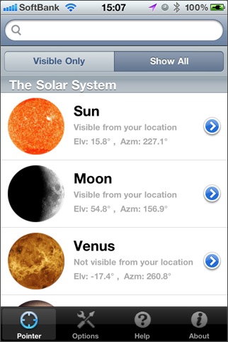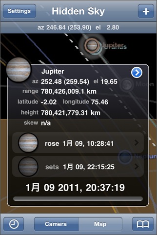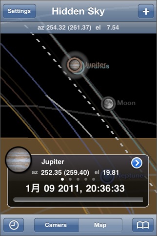 太陽/月/惑星/人工衛星がどこに見えるかをiPhoneのカメラを使って教えてくれる拡張現実ソフト。見たいものを矢印を使って誘導してくれますし、出没時刻を選択することで、どこから昇るのか/どこに沈むのかが分かるので、観測場所を決める時や写真撮影の構図を決めるときなどに便利に使えそうです。星座が表示されるとさらに使いやすくなるかなと思います。 [ GPS / 加速度センサー / 電子コンパス / AR ]
