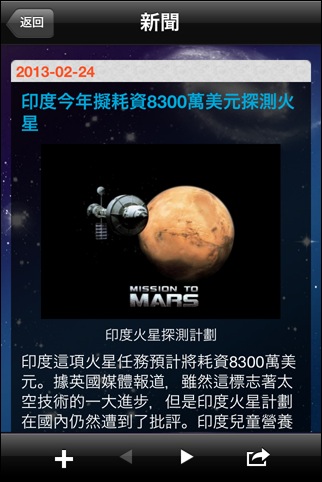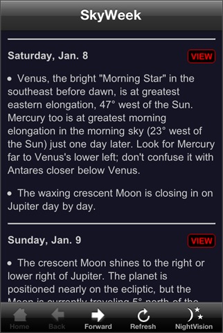 アメリカの天文雑誌の Sky & Telescope の This Week's Sky at a Glance というコーナーのモバイルバージョン。天文現象の解説を読むことが出来ます。SkySafariと思われるプラネタリウムアプリを内蔵しており、天文現象の解説記事をプラネタリウムソフトと連動させているところが面白いです。プラネタリウムの表現力がもう少し欲しいところ。