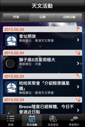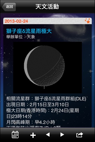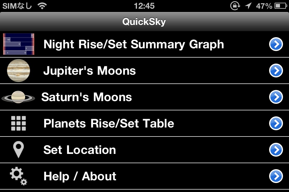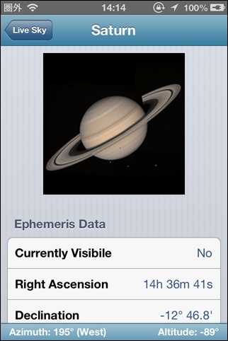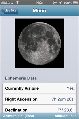 主要な天文イベントをプッシュで通知してくれるアプリ。通知して欲しいイベントの種類や何時間前に通知して欲しいかも選択することが出来ます。表示が英語なのイベントの詳細は文字によるものなのが残念。でも、通知によってイベントを事前に知ることが出来るのはありがたいです。