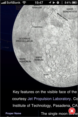 各惑星の衛星も表示、満ち欠けや土星の輪の傾きもきっちり計算してくれます。月や惑星や惑星の衛星も拡大するとクレーターや地名や探査機の着陸地点等が表示されます。