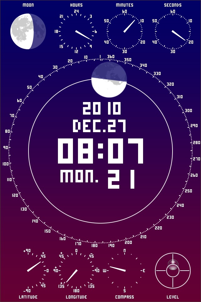 月の形や現在の時刻/緯度/経度/方角等の情報をメーター表示する時計。シンプルですが、なかなか綺麗ですね。画面をタップするごとに背景の色が4種類から選べます。