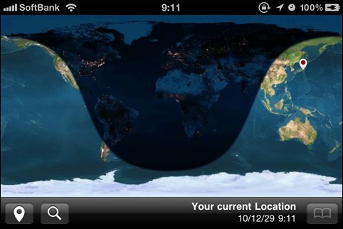 地球の昼と夜をグラフィカルに表示する世界時計アプリ。指定した場所の時刻を表示させることができ、ブックマークに登録することもできます。表示のスクロールや拡大縮小はできません。
