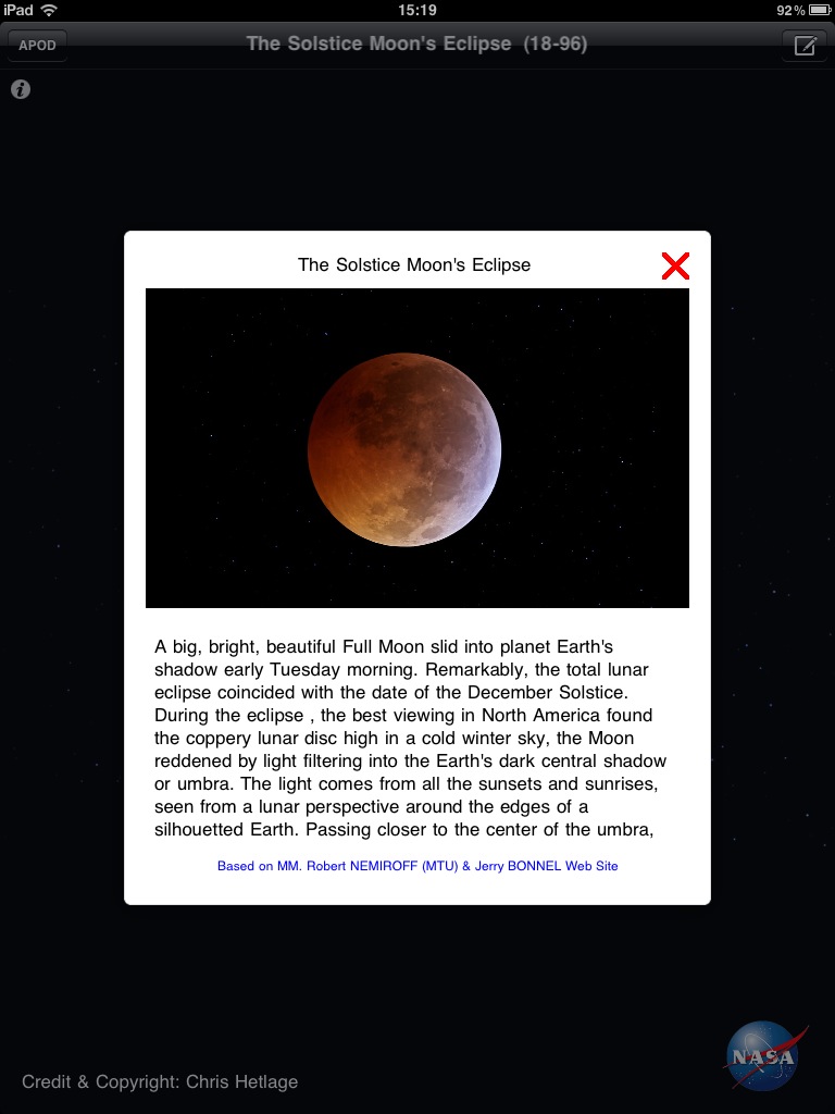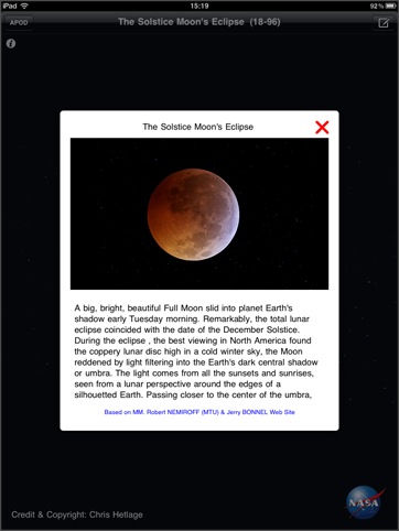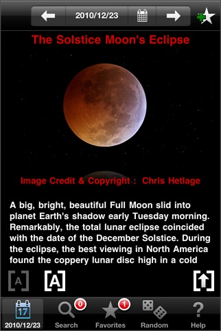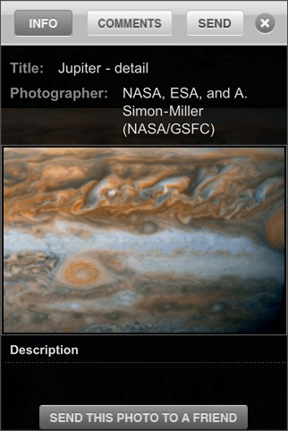 APODを見るためのビューワ。[ Jump to Image ] ボタンを押すと、好きな日付にジャンプしたり、ランダム表示をすることができます。一度見た画像は一時保存されるため素早く表示することができるようになります。UniversalアプリのためiPadの大画面で鑑賞できます。解説文表示に翻訳機能があって日本語に翻訳させて読むこともできます(翻訳結果はともかく)。検索機能は欲しいところかな。