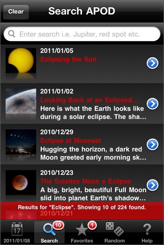 APODを見るためのビューワですが、ウェブサイトに掲載されている説明文も読むことができたり、日付を選んで表示したり、お気に入りを管理したり、ランダム表示できたりと、ひと通りの機能が備わっています。操作も分かりやすい。APODは沢山の画像があるので、文字列検索ができるのが便利。機能限定の無料版もあります(検索機能はありません)。