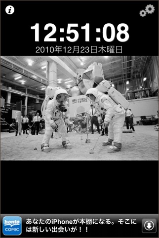 アポロ11号関連の写真を背景に表示する時計アプリです。画像を切り替えるタイミングなどを調整することが出来ます。