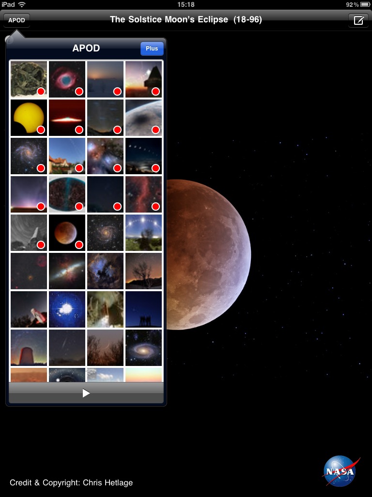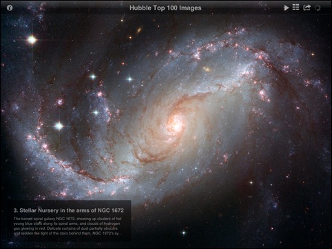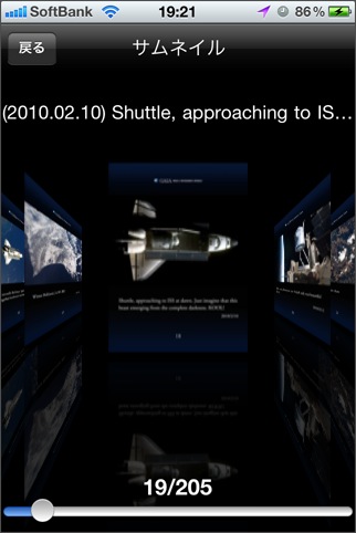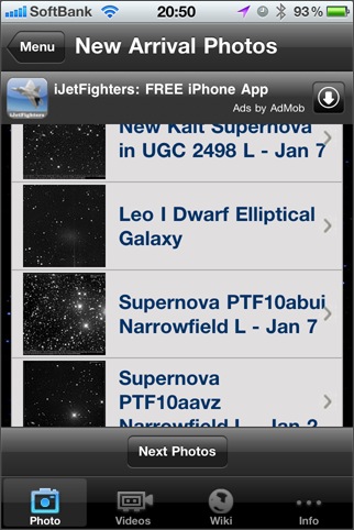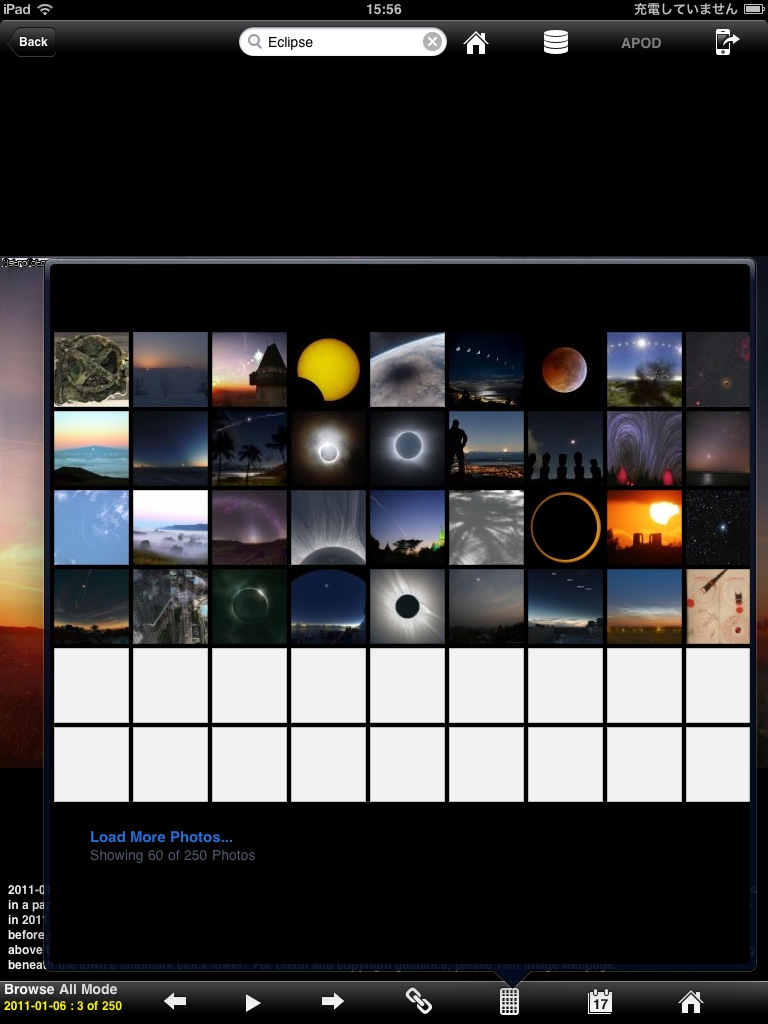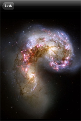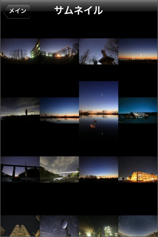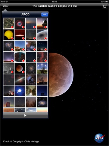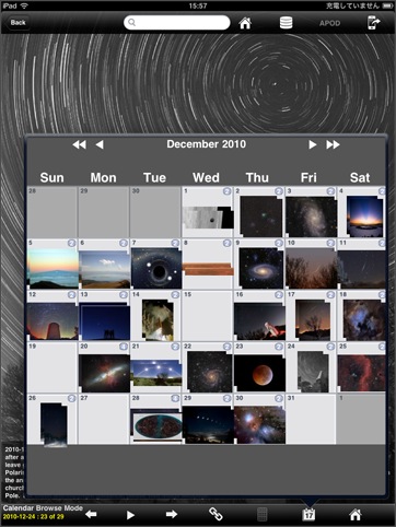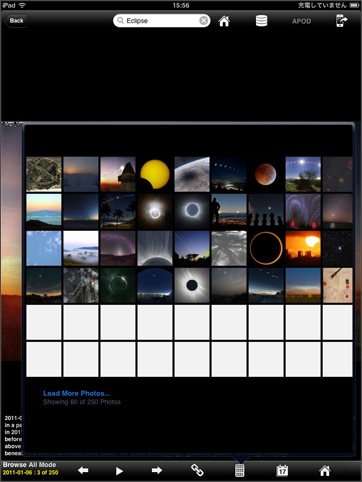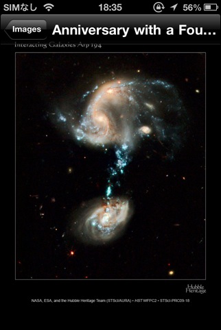iPad対応のHD版を使用しました。APODのビューワですが、最大の特徴はサムネイル表示機能でしょう。APODには、多くの写真があるため、自分が見たい写真に簡単に辿り着けるようにするには、検索機能かサムネイル表示は欲しいところです。iPadの画面で見る写真も迫力があって、スライドショーも楽しいのですが、なぜか画像保存機能がありません。メール送信機能が付いているので、自分宛に送るという方法はあるにはあるんですけど...。