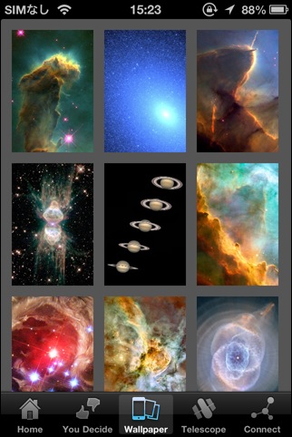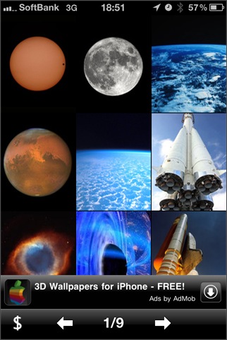 9枚の宇宙関連の写真を見ることができます。有料の壁紙集のサンプル確認用のアプリ(?)。アルバムへの保存機能があります。