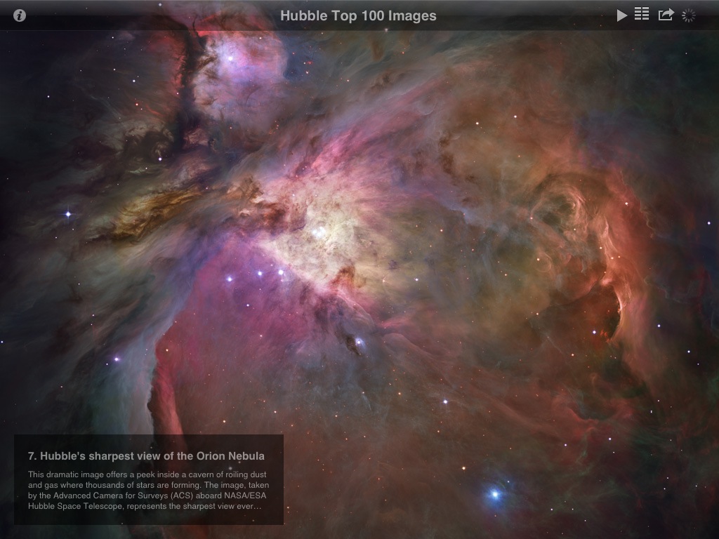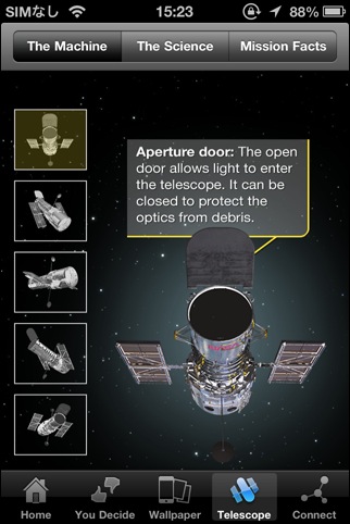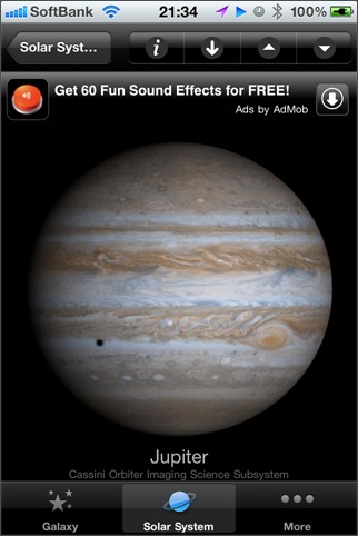 15年分の the Astronomy Picture of the Day、ハッブル宇宙望遠鏡の写真、全てのスペースシャトルのフライト、惑星探査機の写真、星雲/星団/星座の写真などなど...沢山の写真を見ることができるソフト。ただし、写真は、ウェブからダウンロードしてくるため最初の表示はかなり遅いです(なのでちょっと評価は厳し目)。逆に、購入後に写真が追加になることもある(と思われる)のがメリットではありますが...。アプリ内から写真を追加購入することも出来ます。