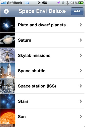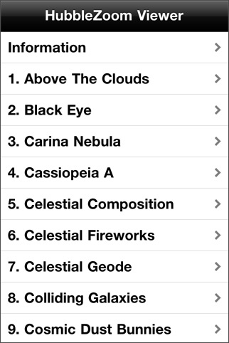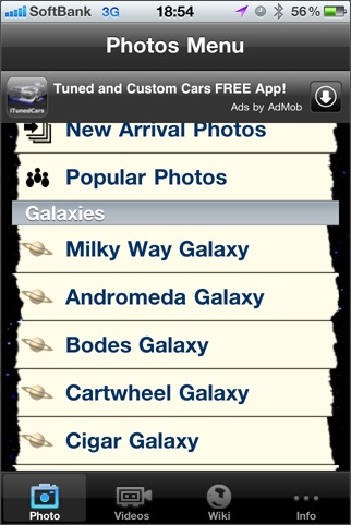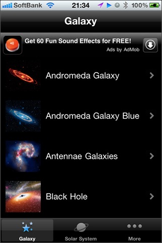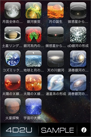60枚の宇宙関連の写真を見ることができるアプリ。カテゴリ分けされていて、好みの画像を素早く選ぶことができるようになっています。iPhone 4等の高解像度に対応していて、アルバムへの保存機能や解説ページ表示機能があります。