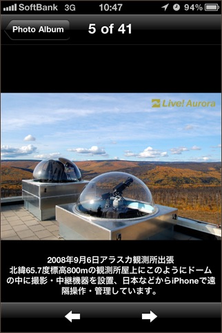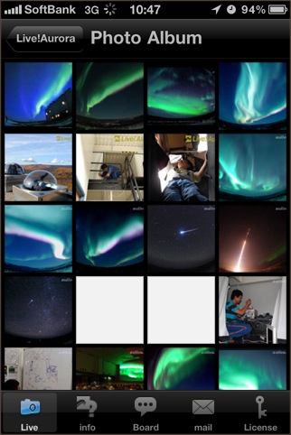 オーロラ中継サイトである Live!オーロラ の映像をiPhoneで見ることが出来るソフト。世界のどこにいても、小さなiPhoneだけでオーロラが鑑賞できるのは素晴らしいです。ソフトは無料で、アーカイブ映像を見ることができますが、ライブの視聴には別途ライセンスが必要です。