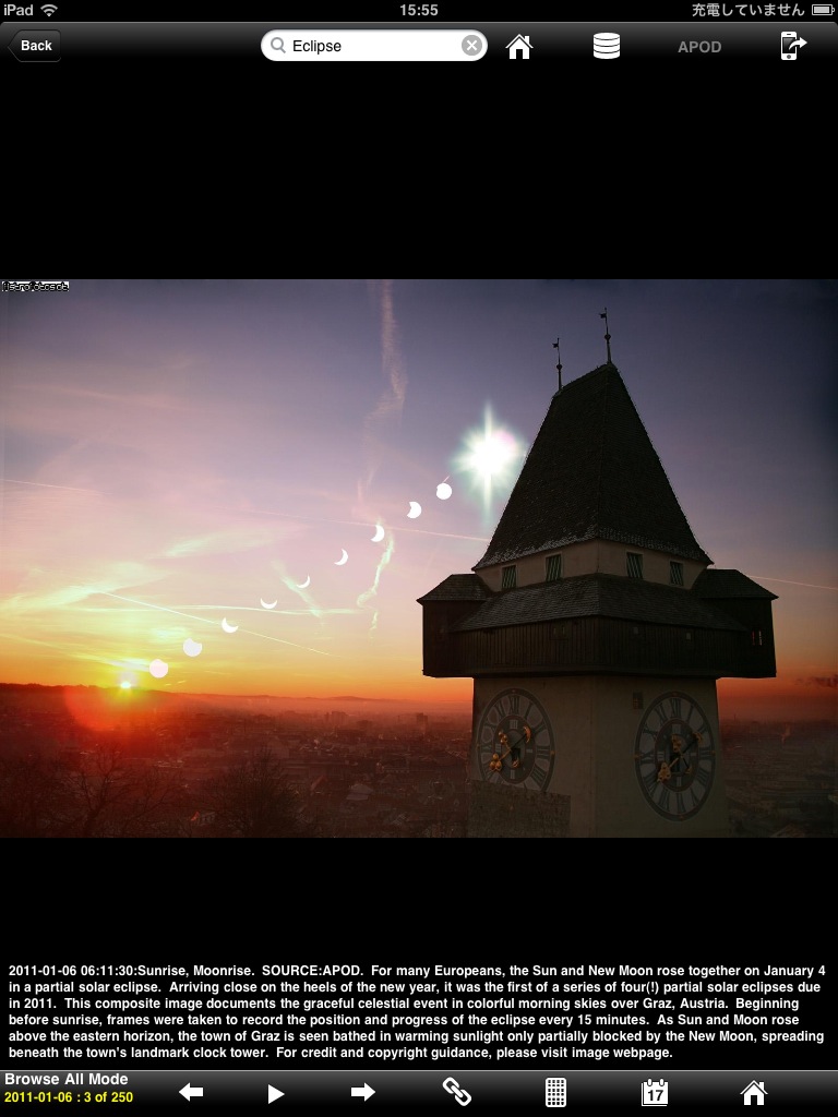 APODの画像をインターネットからダウンロードするのではなく内蔵しており、500MB程のサイズになっています。素早く見たい場合やネット環境の有無に関わらず見たい場合などには有効でしょう。ただし、画像のリストが階層化されてなく、検索機能もないため、閲覧しにくいという残念な仕様。また、画像の拡大/縮小機能や保存機能やフルスクリーン表示機能が備わっていないため、壁紙用の画像としても利用は難しいです。惜しい...。