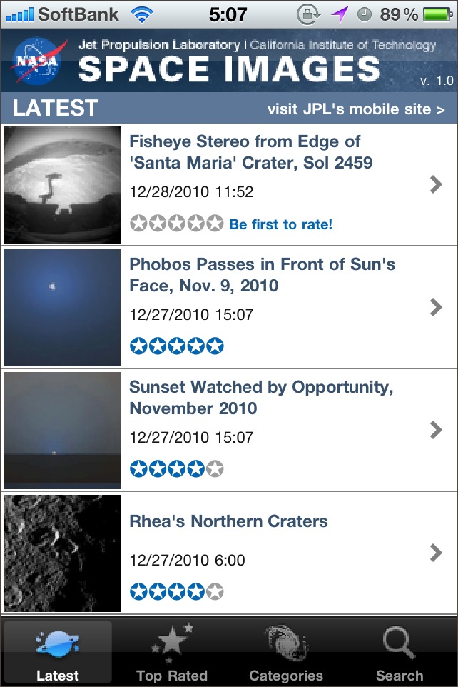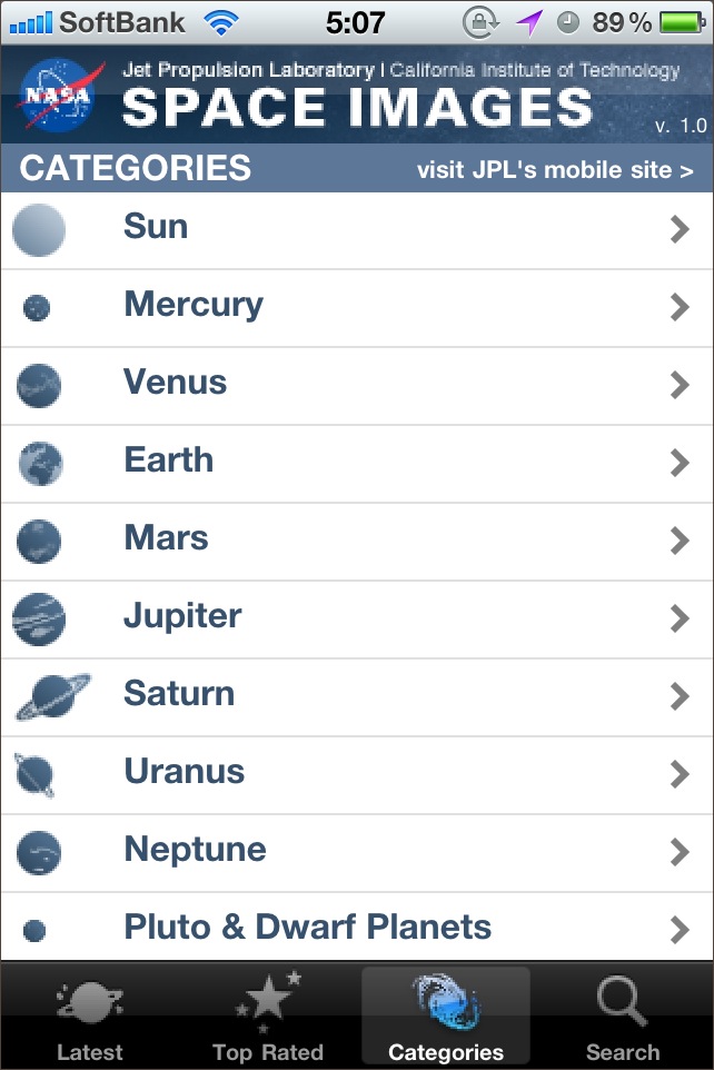 NASAのジェット推進研究所 ( JPL ) のサイトで配布されている画像を見るためのソフト。新しい順や人気順、カテゴリ別、検索して画像を見ることが出来ます。