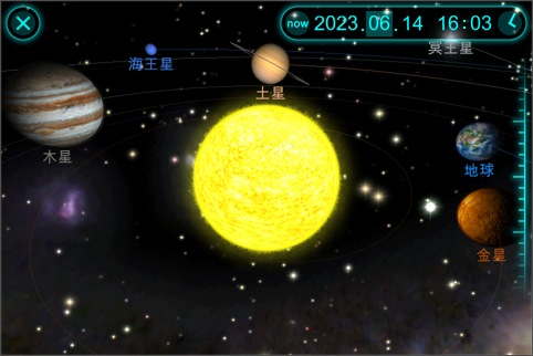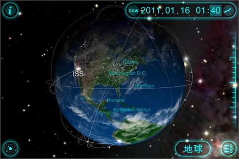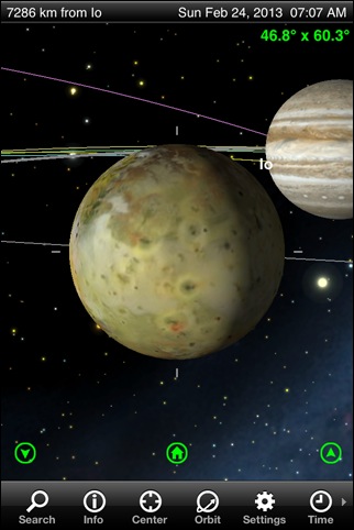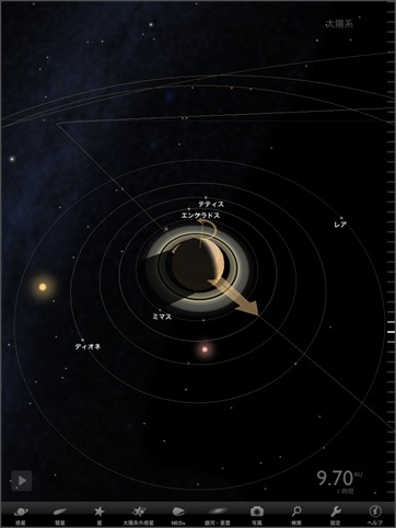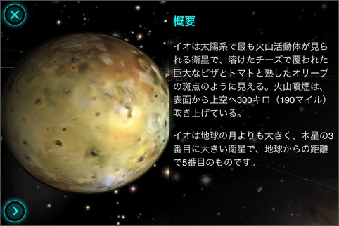 太陽系内を自由に移動して惑星やその衛星を3Dで表示するソフト。起動すると太陽系が表示されるので、行ってみたい星をタップするとその星まで飛んでいきます。まず、地球を見ると地球の周りには主要な人工衛星が飛んでいるのも分かります。行ってみたい惑星やその回りの衛星をタップするとビューンと一気に接近することが出来て、その天体を追尾する軌道に入ります。一応太陽系を飛び出して銀河系の様子をみることが出来ますが、周囲の星の情報等は一切表示されずオマケ機能のような感じなのは残念。ただし、全体にグラフィックも演出も非常に美しくてお薦め。BGMも雰囲気を盛り上げてくれます。各天体の情報表示機能もあります。