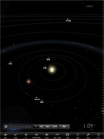 宇宙旅行系のソフトにほぼ共通で言えますが、惑星などの天体はかなり大きく表示しています。これは、リアルな大きさで表示してしまうと天体があまりに小さく、選択や移動が困難になってしまうためです。大きさに関してはかなり誇張されている場合があることを念頭におき、間違った知識を持たないように注意しましょう。