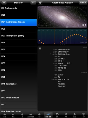 このソフトは、移動範囲の広さだけでなく、小惑星 / 水星 / 太陽系外惑星 / 星雲 / 星団といった天体のカタログも持っています。NEOと呼ばれる地球に接近する天体の情報もあり、軌道を表示させてアニメーションさせると、どのように地球に近づくのかが明確にわかります。地球との距離の変化のグラフ表示もあります。星雲 / 星団カタログは写真もあり、データベース的にもかなり充実しています。グラフィックも美しいし、授業とかにもいいかもしれません。