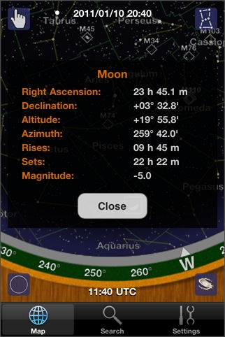 スタンダードなプラネタリウムソフト。一見シンプルに見えますが、拡大していくと月の形や惑星の模様やメシエ天体の写真なども見ることができますし、グラフィックも綺麗です。値段の割にはよくできていると思いますが、スクロールが遅いのが難点かもしれません。 [ プラネタリウム | 月の形 | 日食/月食 / GPS ]