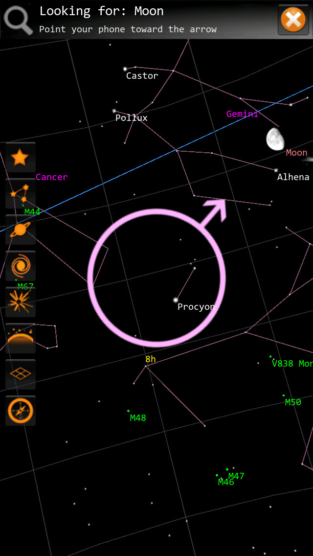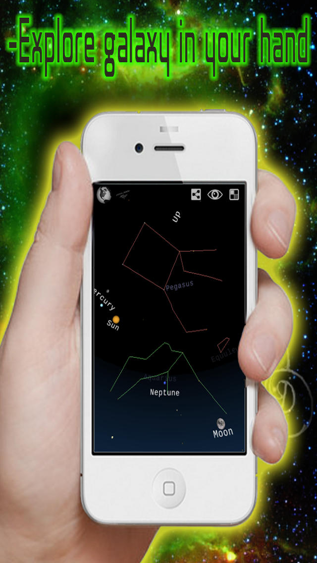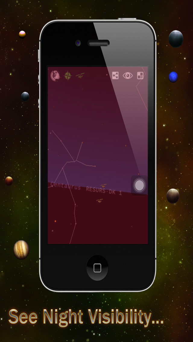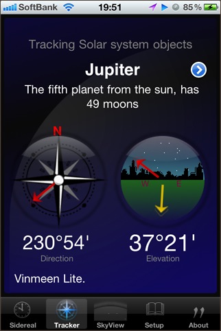 太陽系天体や人工衛星を拡張現実(AR)を使って見える位置をガイドしてくれるソフト。起動するとカメラの映像にプラネタリウムの画像が合成されて表示されます。空にかざすと、そこに見えている星座や惑星や人工衛星が何かを表示してくれます。