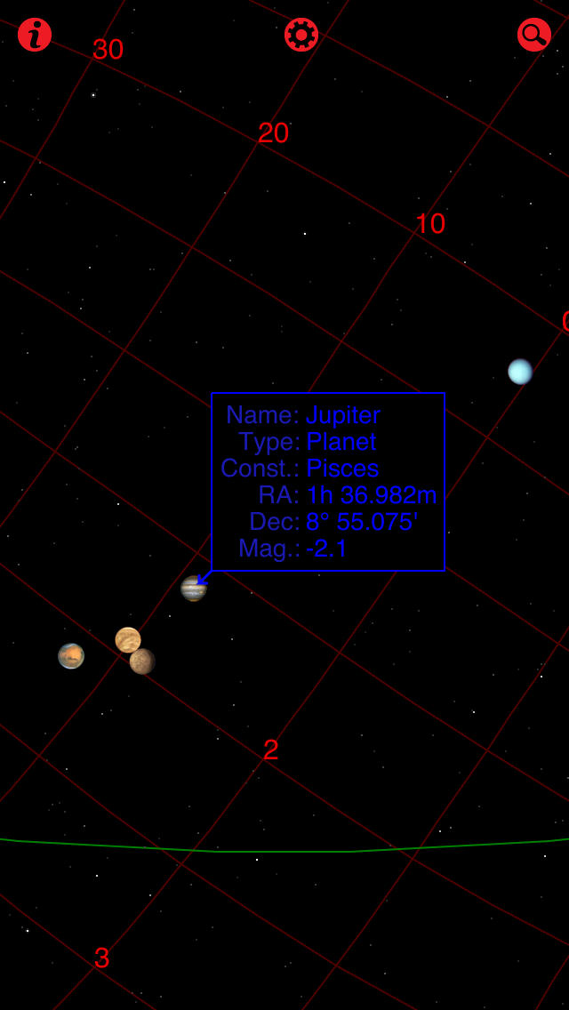 比較的シンプルなプラネタリウムソフトです。天体ごとに現在の高度/方位を表示してくれます。