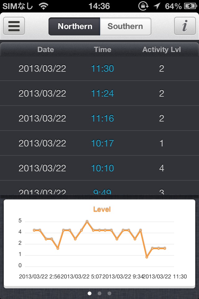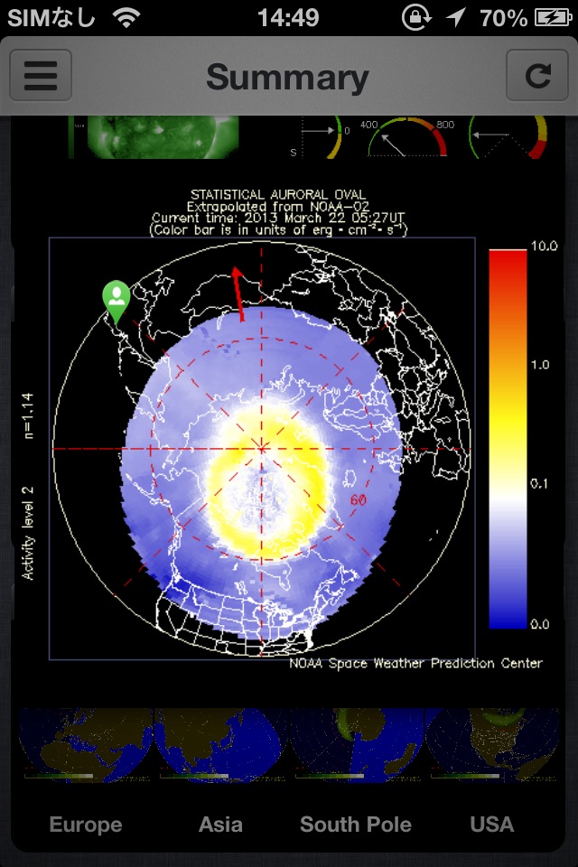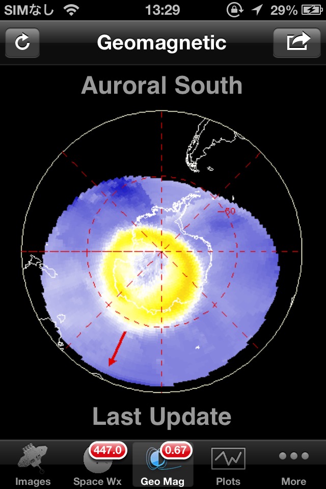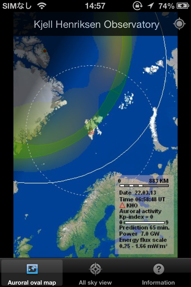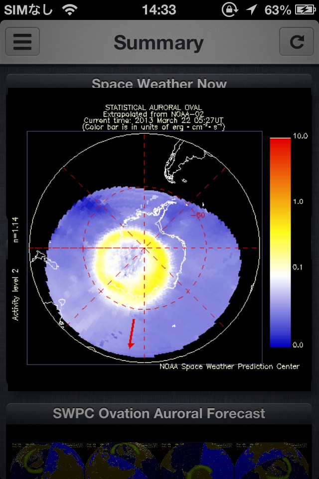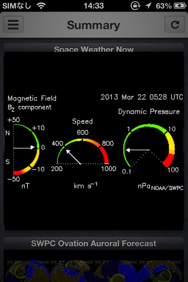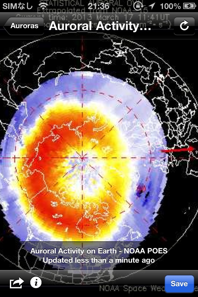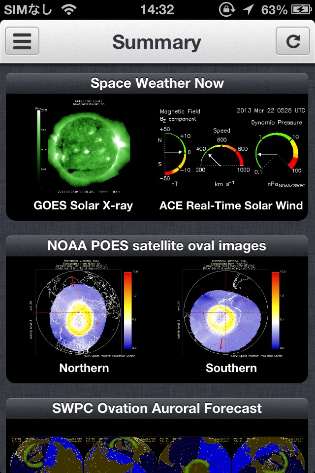 オーロラの現在の情報や予報を表示するソフト。太陽の活動状況もあります。情報が多すぎず、画面デザインも洗練されています。通知機能もありますが有料です。