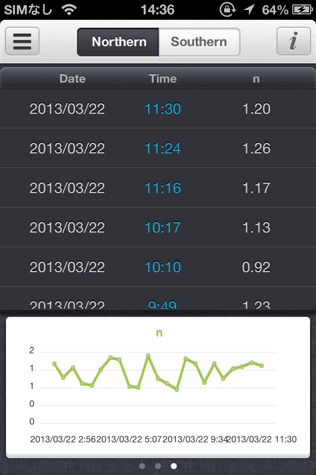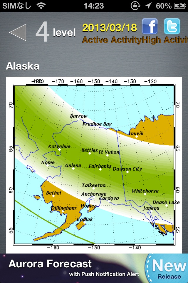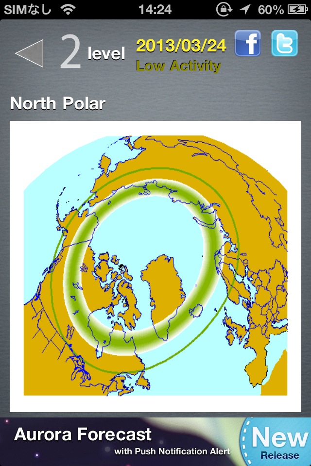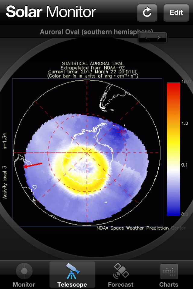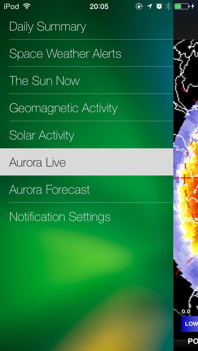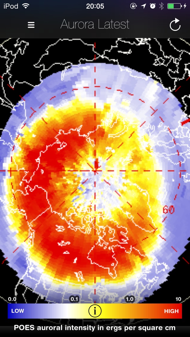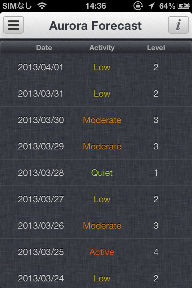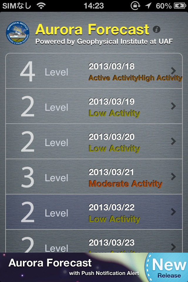 オーロラの現在の情報や予報を表示するソフト。太陽の活動状況もあります。情報が多すぎず、画面デザインも洗練されています。通知機能もありますが有料です。