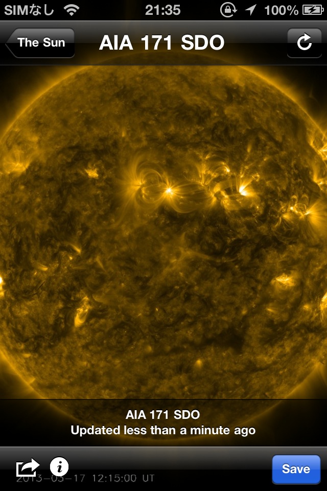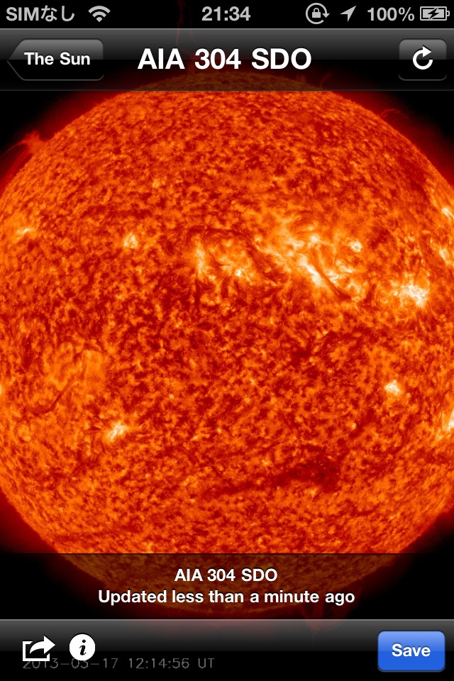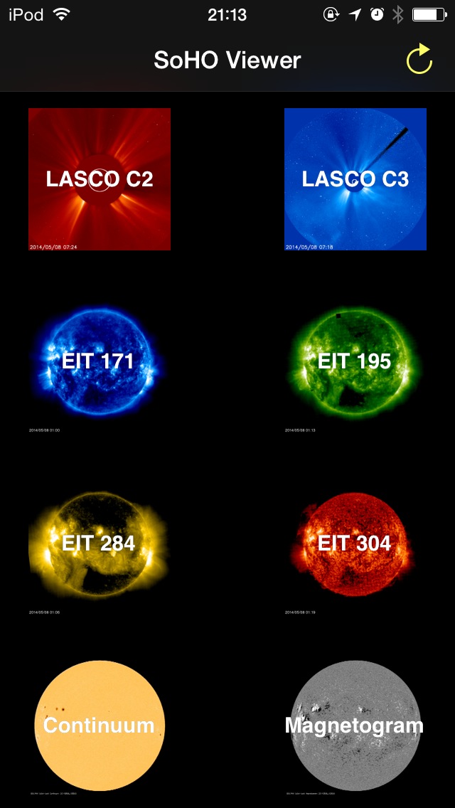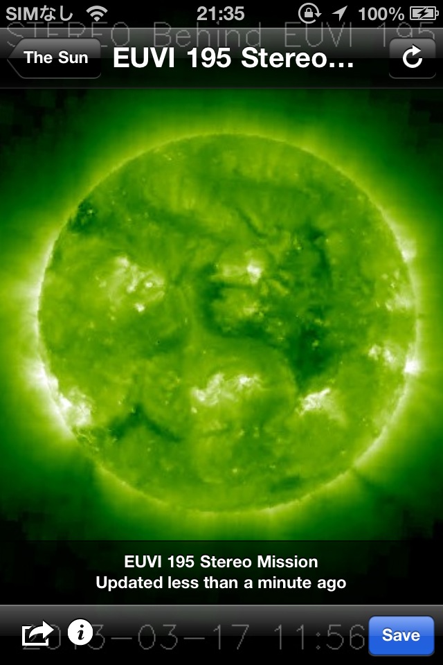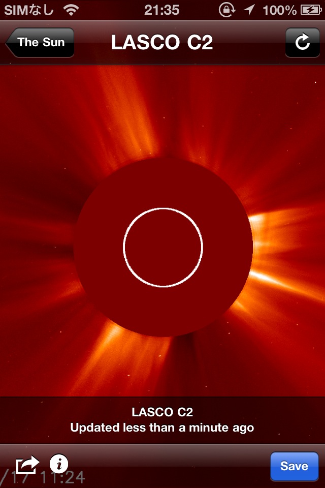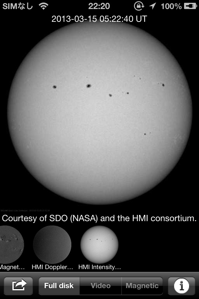 太陽観測衛星 SOHO からのリアルタイムの映像 ( 8種類 ) を表示するソフト。太陽面を様々な波長の光でとらえた写真を見ることができます。iPadに対応したUniversalアプリという以外は、これといった特徴があるわけではないですが、現在の太陽の映像を見るだけなら十分楽しめます。初心者にオススメでしょうか。