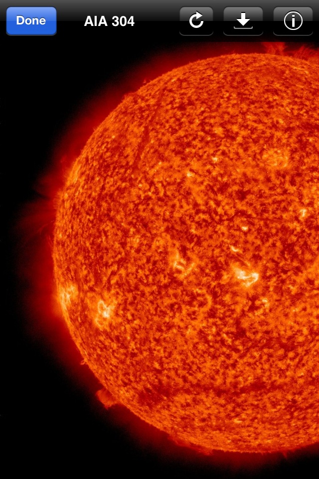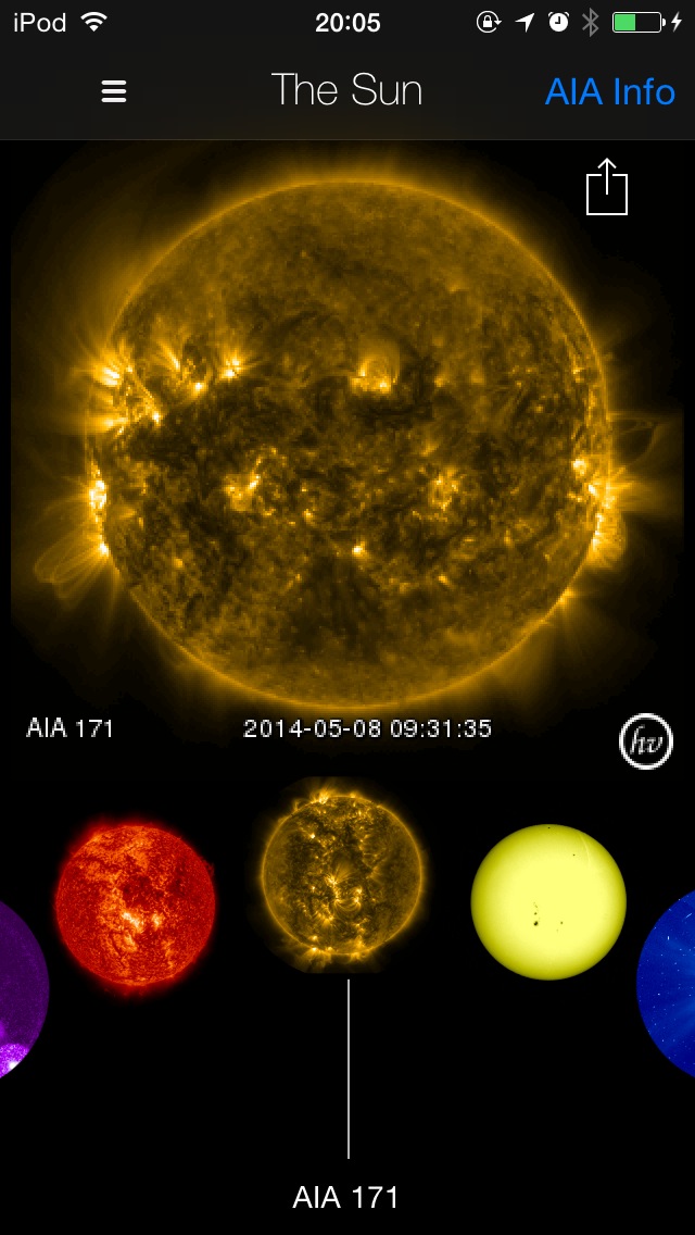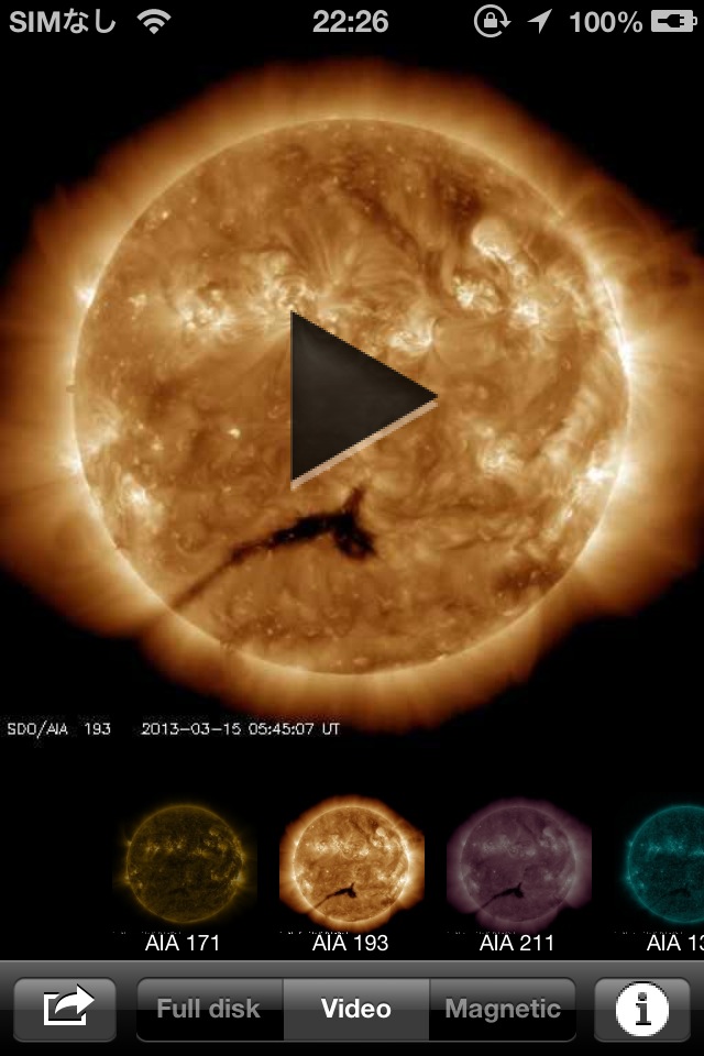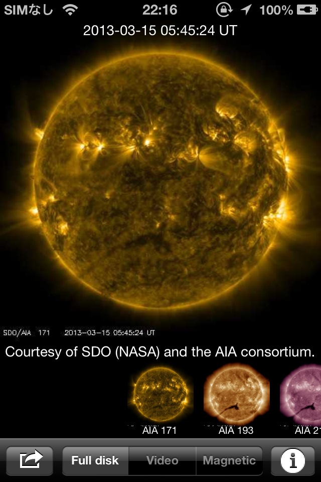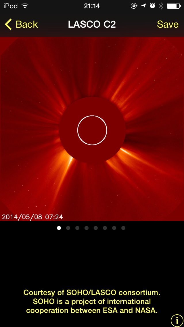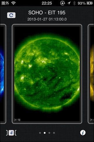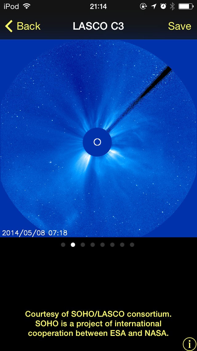 太陽観測衛星 SOHO からのリアルタイムの映像 ( 8種類 ) を表示するソフト。太陽面を様々な波長の光でとらえた写真を見ることができます。iPadに対応したUniversalアプリという以外は、これといった特徴があるわけではないですが、現在の太陽の映像を見るだけなら十分楽しめます。初心者にオススメでしょうか。