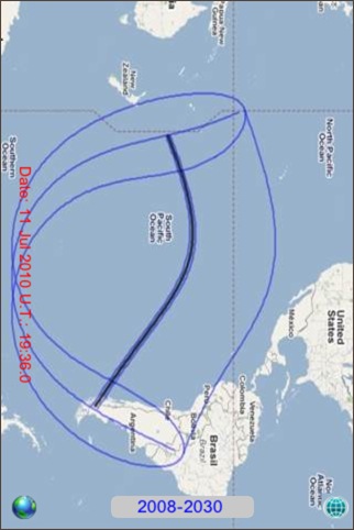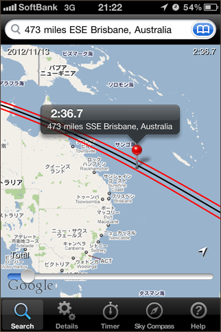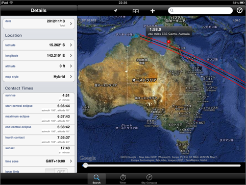 日付を選択すると、日食や月食が見られる地域を表示してくれるソフト。地図の下の方にあるスライダーを動かすことで、各地点での皆既日食の長さを確認することも出来ます。circaというソフトとほとんど同じですが、Universal化されていますし、日付選択ができないという不具合も修正されていますので、こちらを購入した方が良いでしょう。