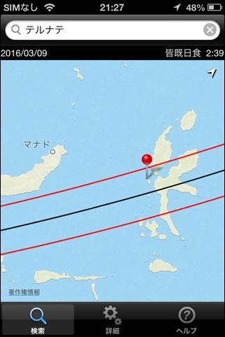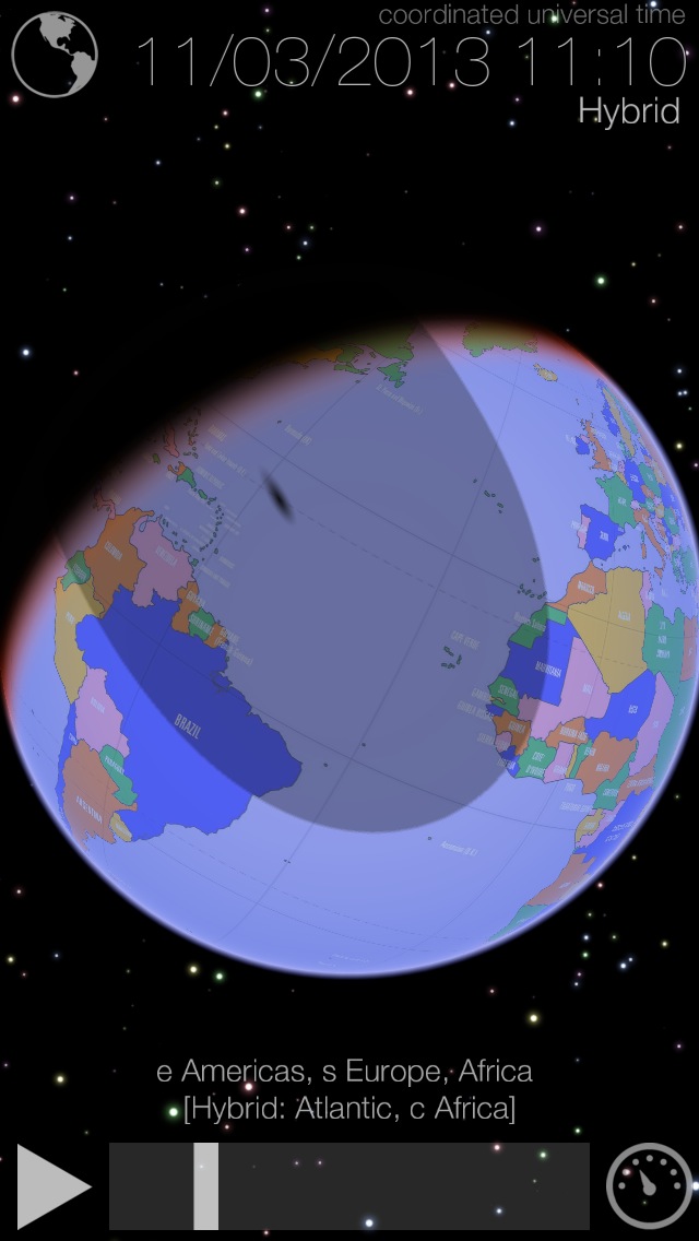 日食のアプリというと地上からどのように見えるかというものがほとんどですが、このアプリは、地球の外から眺めるというちょっと変わったアプリです。どういうことかというと、月の影が地球表面にどのように落ちるかというのをアニメーションで見ることができるということです。