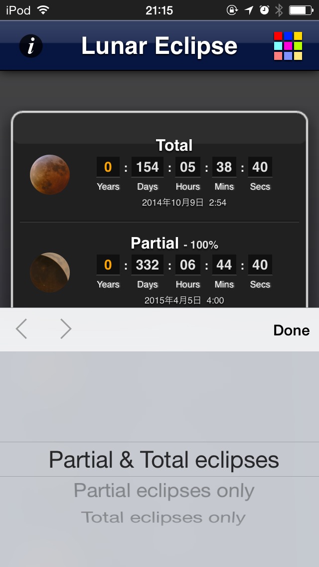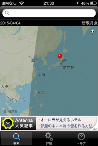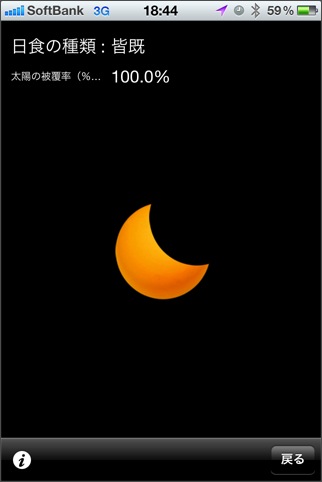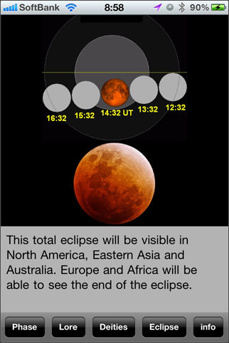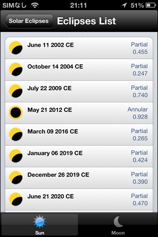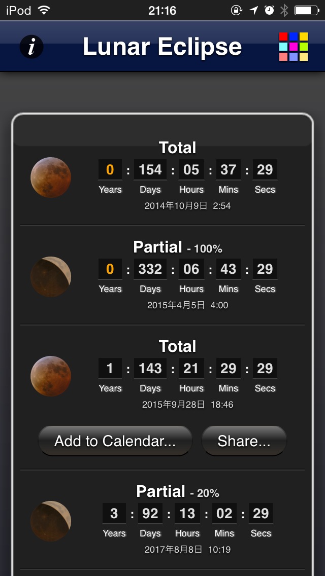 これから起きる月食までのカウントダウンを行うアプリ。この画面に表示されている情報以上の情報は表示されません。カウントダウンということで過去の月食は消えてしまいますし、現時点では2019年までの予報のみです。カレンダー登録機能もありますが、開始時刻と終了時刻は同じだったり。ちょっと辛口になってしまいましたが、画面デザインはよいので、情報を充実させて欲しいところ。