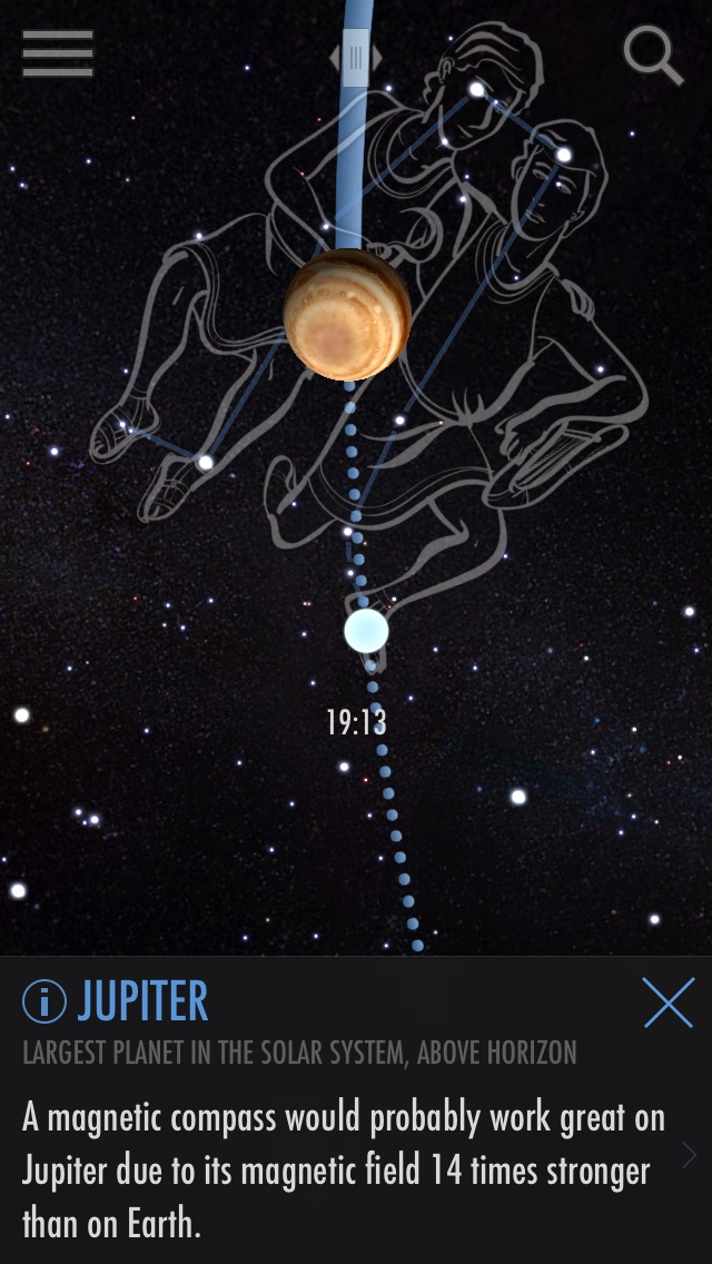 逆に、この星座や天体が見たいという場合は、リストから選択すると矢印が表示されますので、その方向にカメラを向けることで見つけることが出来ます。月や惑星の場合は、現在位置だけでなくこれからどう動くかの経路とそこに到達する時刻も表示されます。例えば、日没の時の太陽を撮影したい時など、どこに見えるのかを予め確認できて非常に便利です。人工衛星の経路まで表示されると、さらによくなると思います。