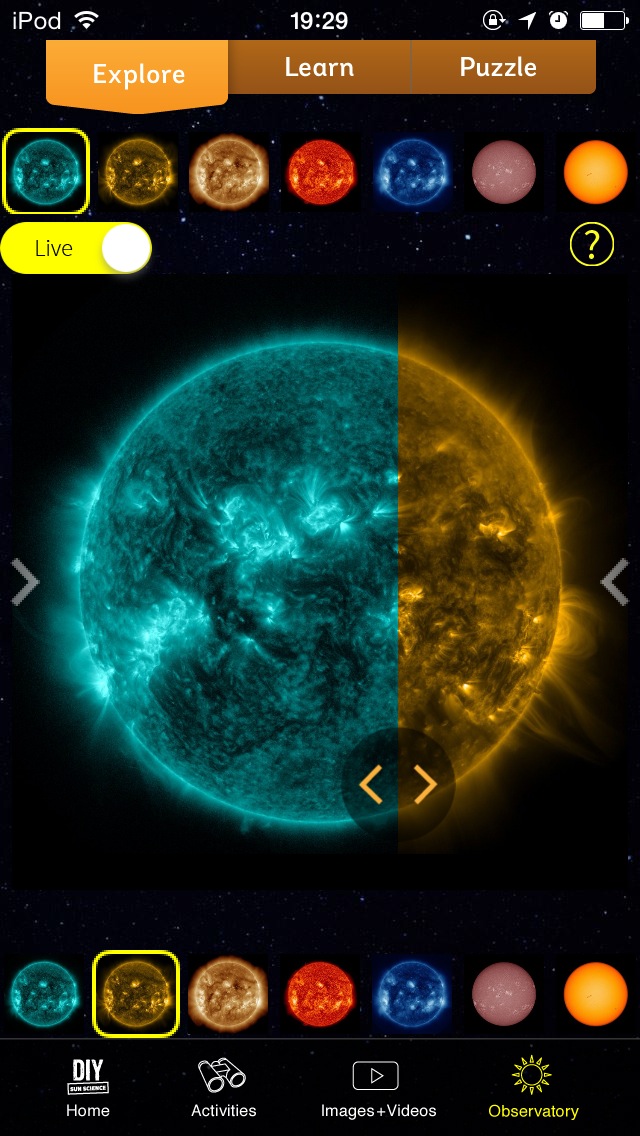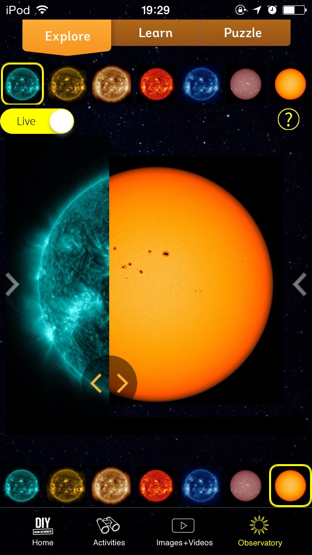 太陽を学ぶための教材アプリ。このアプリが面白いのは、太陽の2つの異なる波長の光を重ねて表示させることが出来るところ。また、簡単な太陽に関するクイズもあります。