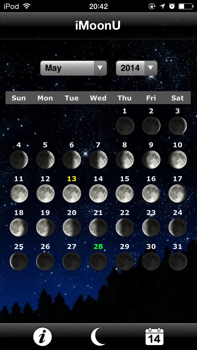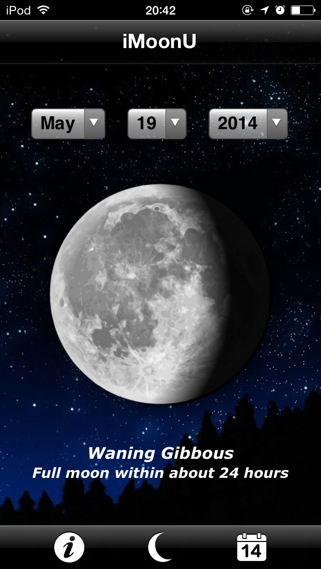 指定した日の月の形や月齢カレンダーの表示をするソフト。わずか2画面しかないとてもシンプルなソフトです。次の満月までのカウントダウン機能もあります。画面デザインが綺麗です。
