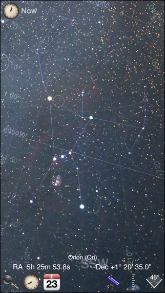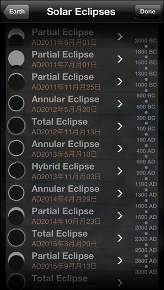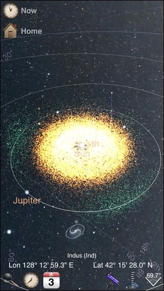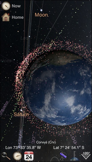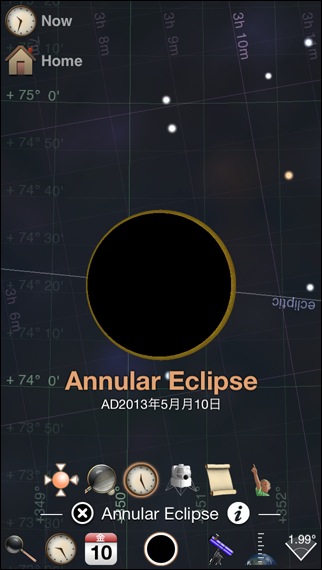 さらに、人工衛星の表示機能もあります。うじゃうじゃと表示されます。人工衛星の目線で地球の周りを飛び回ることも出来ます。小惑星も全部表示させるとものすごい数が表示されます。日食・月食のデータベースも内蔵されています。残念なのは、星雲・星団の表示かな。ハッブル宇宙望遠鏡の写真を後から貼付けたように表示されます。それも一部のものだけ。