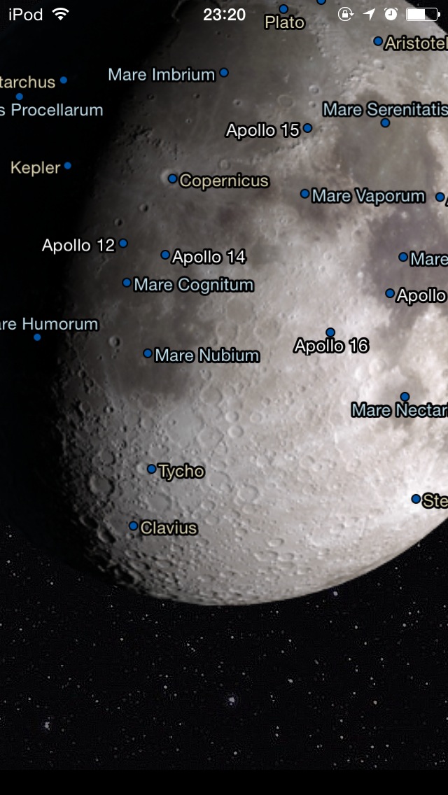 指定日の月の形や月齢カレンダーを表示するソフト。画面を横にスワイプすると前後の日に移動 ( 秤動も計算しているよう )。ピンチで拡大縮小。拡大時には月面の地名やアポロなどの着陸地点が表示されます。月食の日は「 Eclipse 」と表示されます。月の表示も綺麗でオススメ。