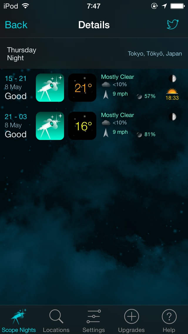 今日は天体観測に向いているか、天気や雲量、月の明るさ等の条件から判定してくれるアプリ。条件設定もカスタマイズできます。
