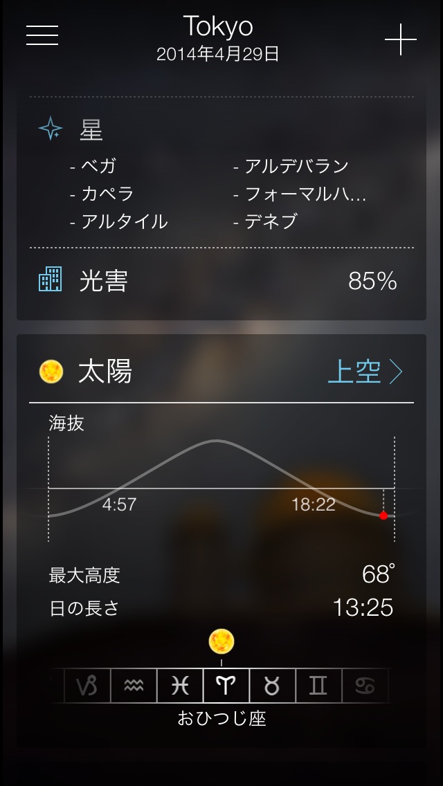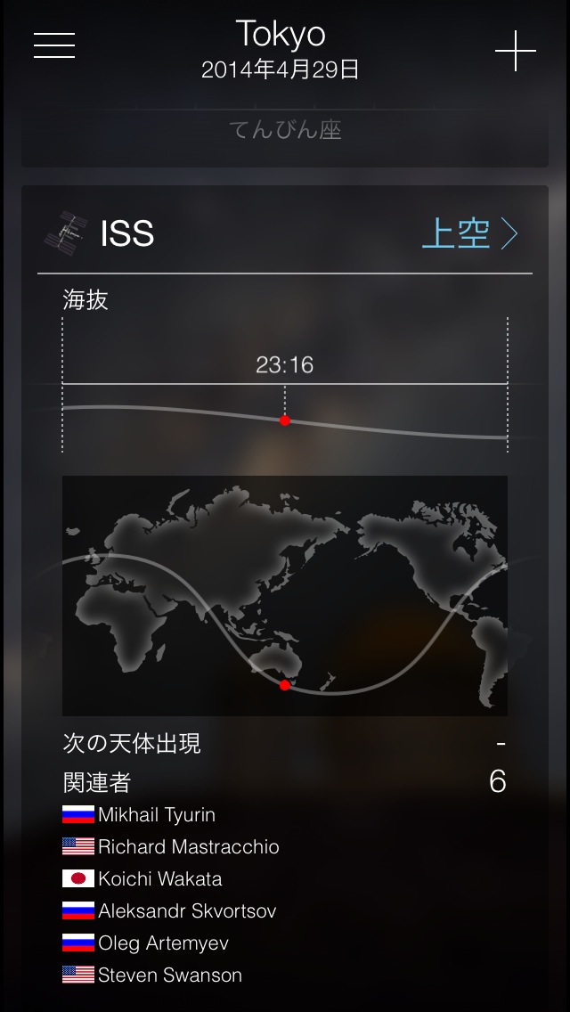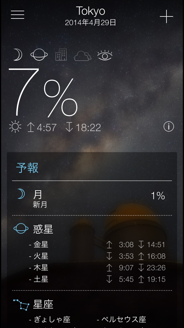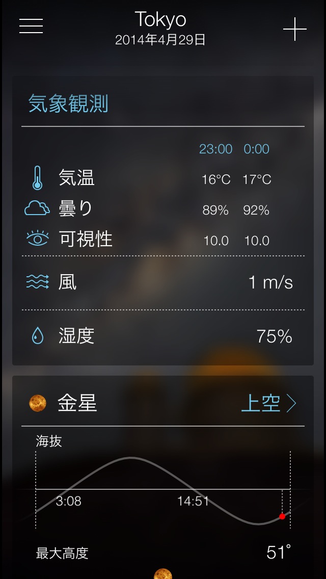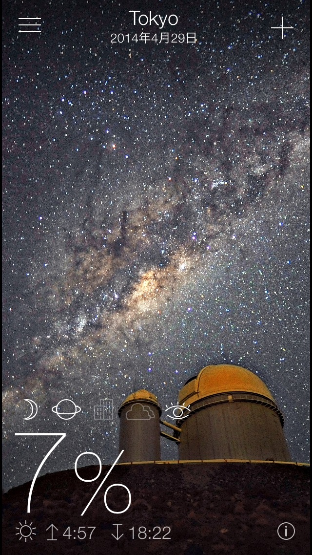今日の天気など気象情報と、見える星や流星群や国際宇宙ステーションなどの天文情報を同時に見ることが出来るアプリ。細かい天文現象は表示されませんので、本格的な天文観測用ではありませんが、画面デザインがとても美しく、見ていて楽しいアプリ。